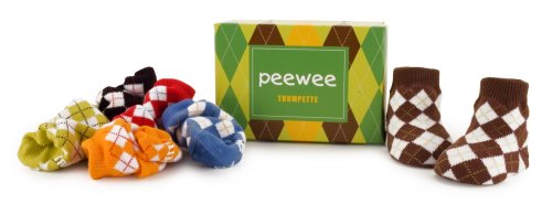 6 pairs of brightly colored pewee argyle baby socks for boys. 6 different colors included in gift box.