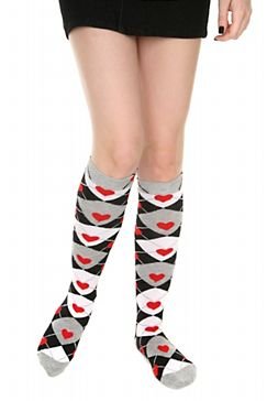 These fun knee highs have a black, white and grey argyle pattern with red hearts.