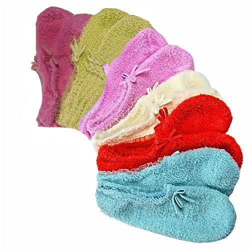 These could not be any softer and prettier if they tried. These ped socks are fuzzy and soft ballerina style slippers, trimmed with a matching bow and sheer ribbon.